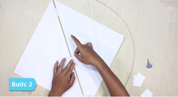 Đặt cánh cung vào diều sao cho dây cung vuông góc với thanh tre đã dán. Để đảm bảo giấy dính chắc vào khung, bạn nhớ dán ở mép để cánh, để tránh bị bung khi gió thổi.