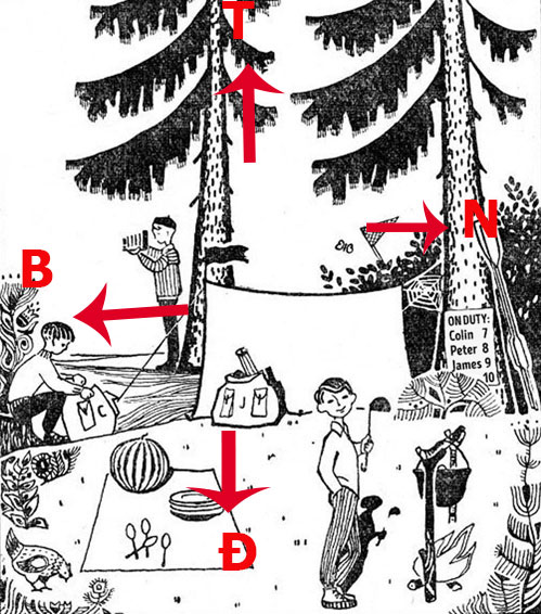 Nhìn vào lịch trực, ta biết rằng Alex là người không có mặt trong hình. Và tự nhiên lại có cái vợt bắt bướm hiện ra đằng sau lều thì hẳn là của cậu ta.